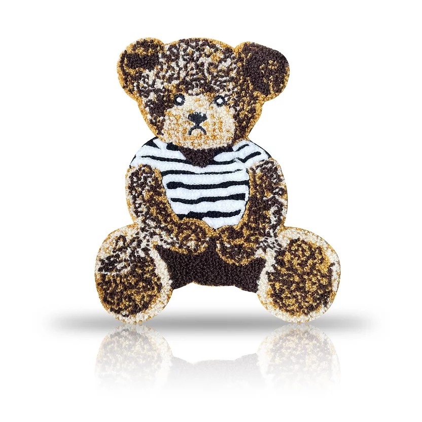 applicazione termoadesiva raffifurante un orsetto seduto, patchgrande realizzata interamente in punto spugna 16 cm x 18, 5 cm