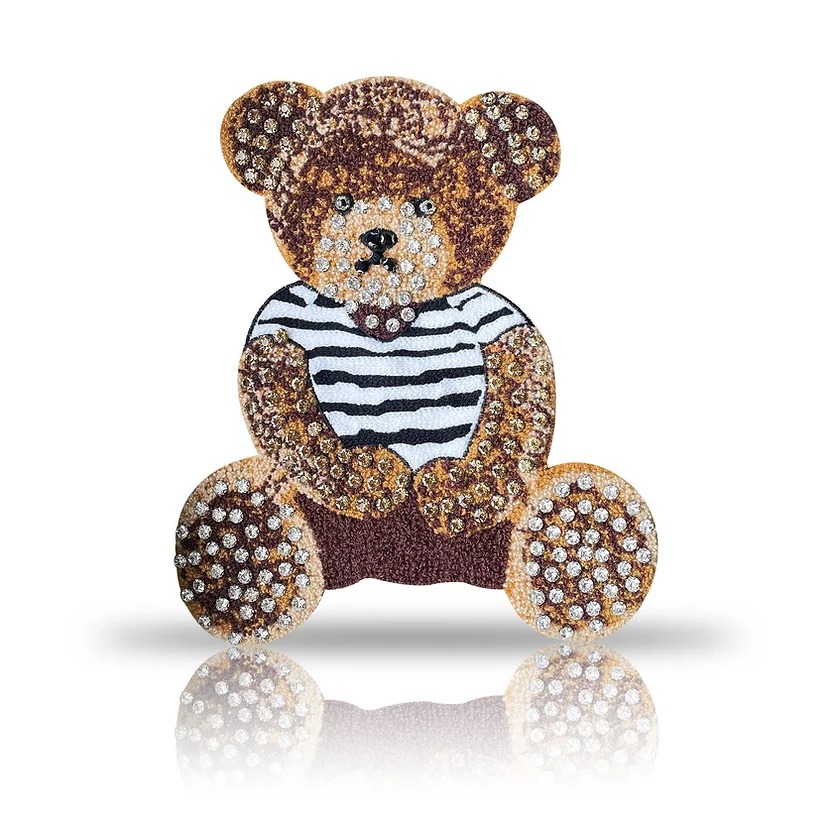 applicazione termoadesiva raffifurante un orsetto seduto, patchgrande realizzata interamente in punto spugna con inserti di piet
