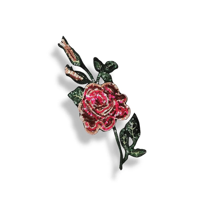 applicazione termoadesiva raffigurante dei fiori con petali e foglie,patchgrande realizzata interamente con paillettes ricamate