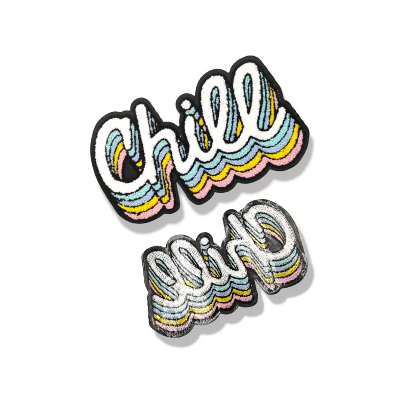 applicazione termoadesiva raffigurante la scritta ” chill “, patch grande interamente realizzata con ricamo in punto spugna, su