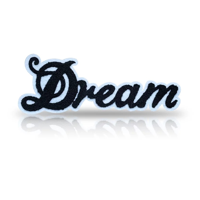 applicazione termoadesiva raffigurante la scritta ” dream ” , patchgrande ricamata interamente in punto spugna nero su fondo bia