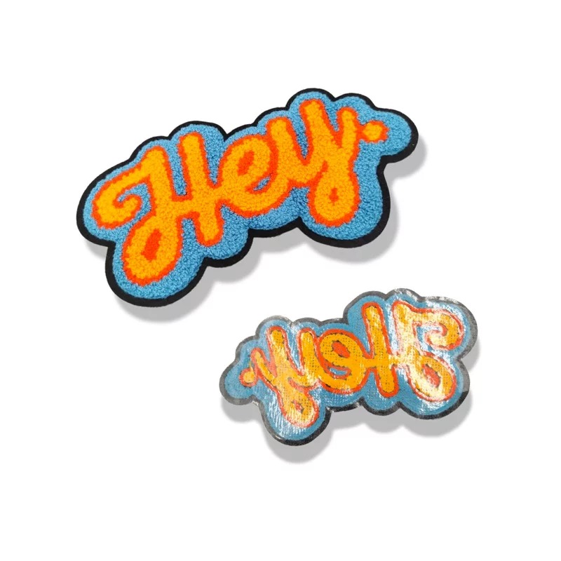 applicazione termoadesiva raffigurante la scritta ” hey “, patchgrande interamente realizzata con ricamo in punto spugna, su bas