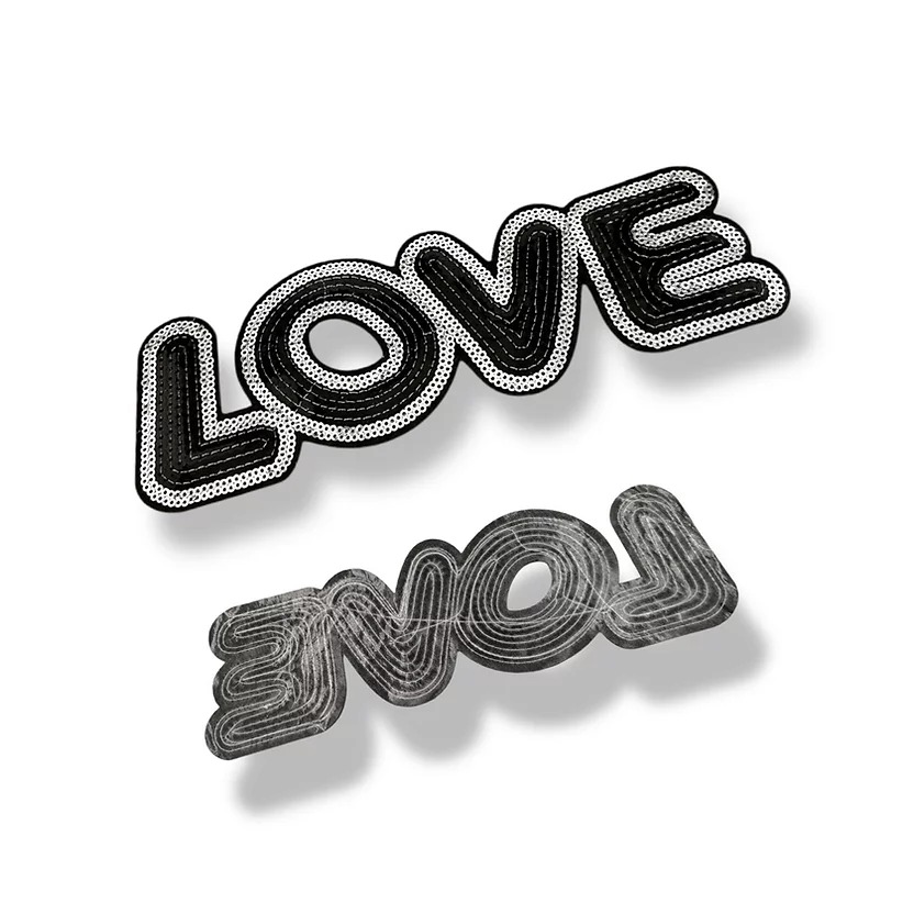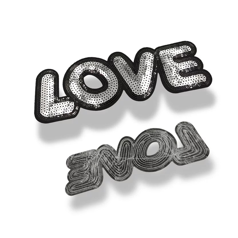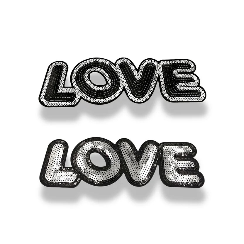 applicazione termoadesiva raffigurante la scritta ” love “, patchgrande realizzata con paillettes lucide, ricamate interamente