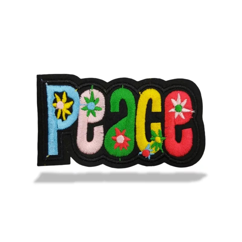 applicazione termoadesiva raffigurante la scritta ” peace ” realizzata interamente a macchina con ricamo a rilievo 55 mm x 98 mm