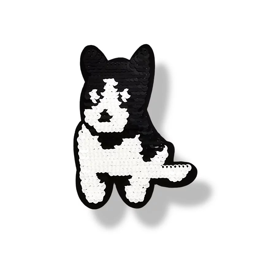 applicazione termoadesiva raffigurante un cagnolino, realizzata con paillettes reversibili, interamente ricamate a macchina 12 c