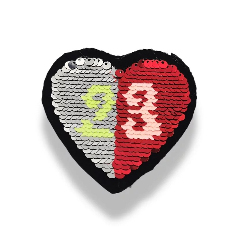 applicazione termoadesiva raffigurante un cuore con numeri, realizzata con paillettes reversibili, interamente ricamate a macchi