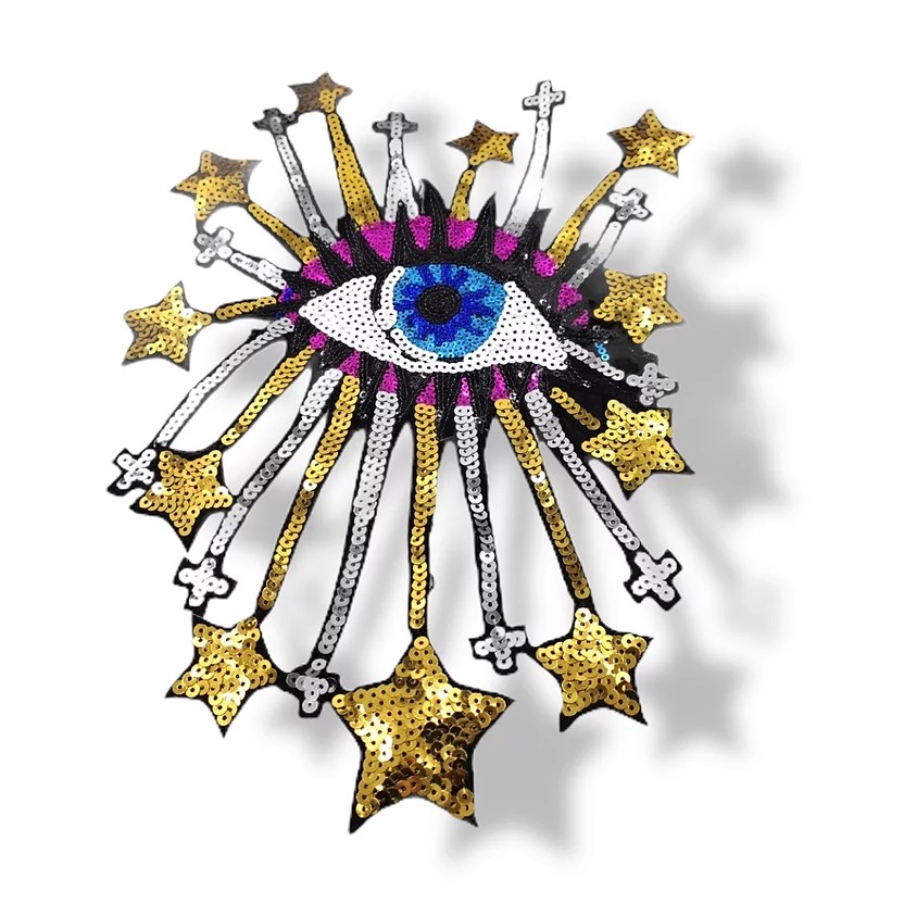 applicazione termoadesiva raffigurante un occhio con stelle, patchgrande realizzata con paillettes ricamate interamente a macchi