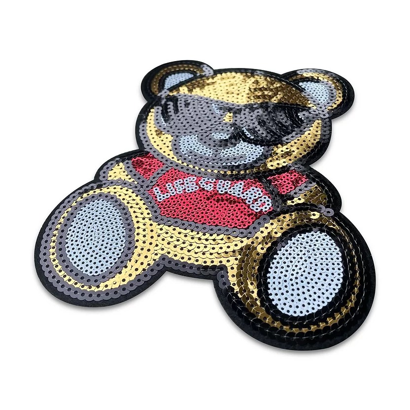 applicazione termoadesiva raffigurante un orsetto con occhiali neri e maglietta rossa, patch grande interamente realizzata con paillettes ricamate a macchina 18,5 cm x 15 cm