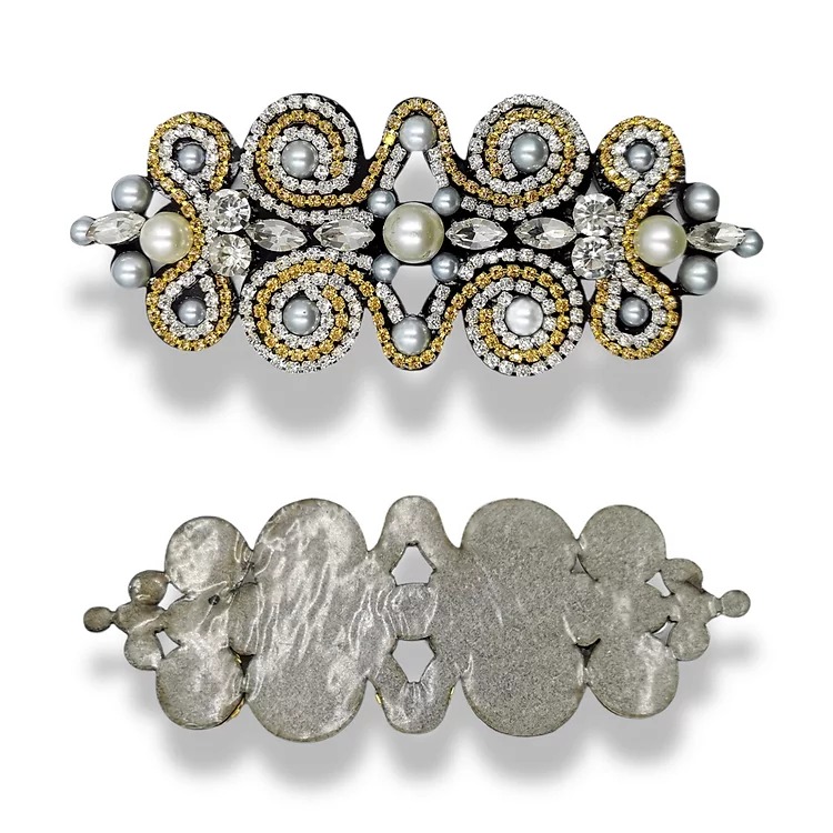 applicazione termoadesiva, realizzata con file di strass, pietre di color crystal e perle 5,5 cm x 13,5 cm