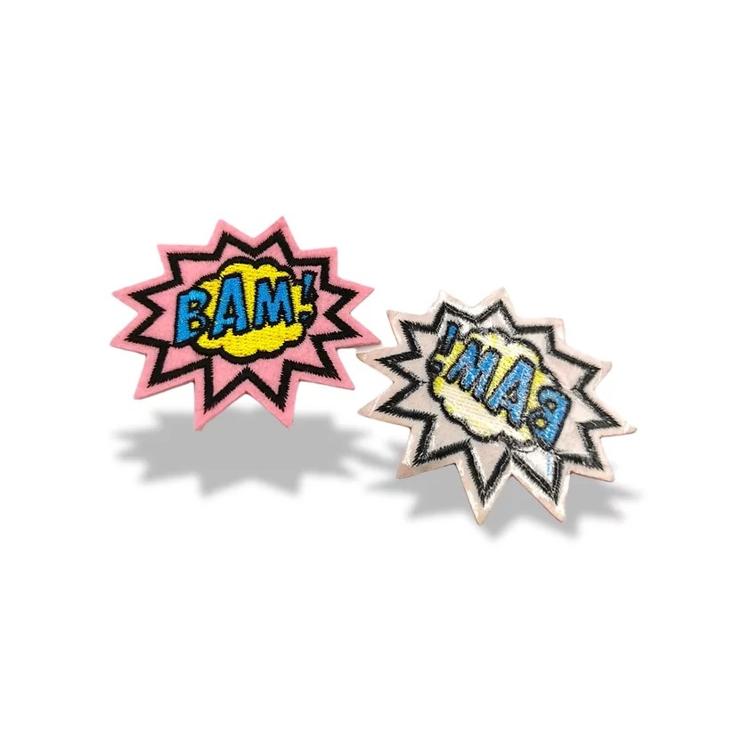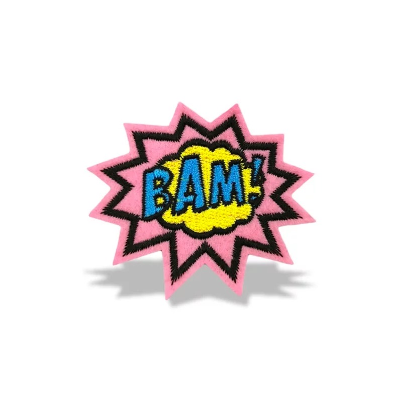 applicazione termoadesiva, realizzata su base panno lenci e ricamata interamente a macchina, con la scritta bam in evidenza 58 m