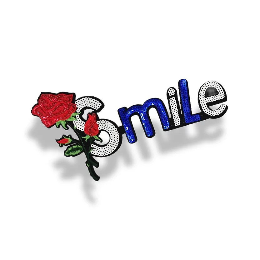 applicazione termoadesiva ricamata interamente a macchina, la scritta È realizzata con file di paillettes ricamate e il fiore È