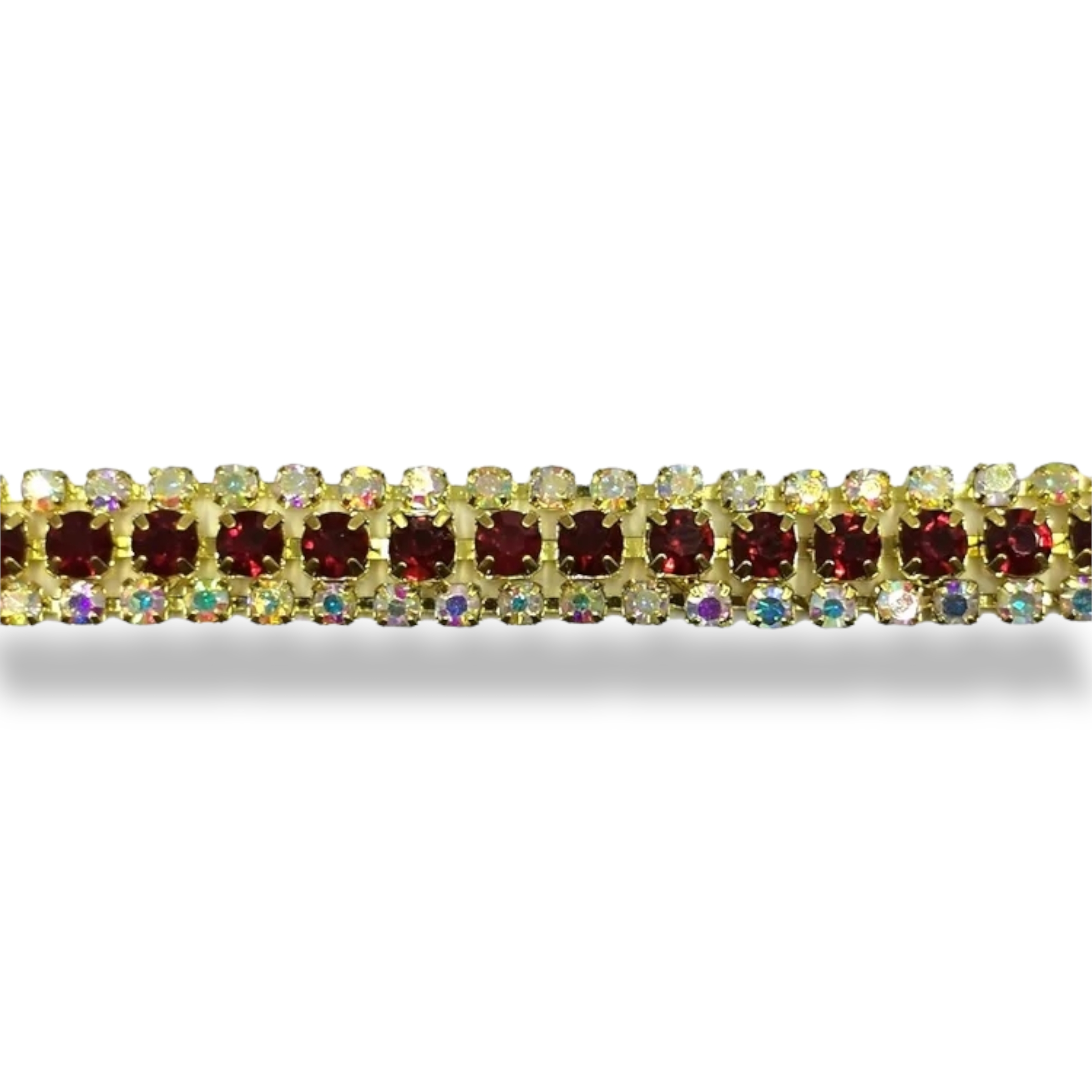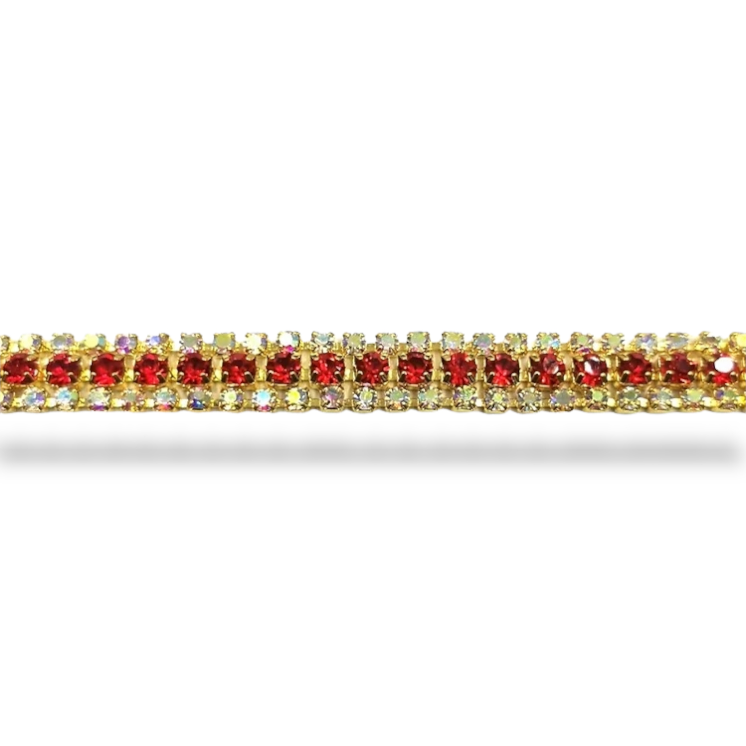 catena termosaldata realizzata su base oro giallo, formata da una fila centrale con pietre colorate e le due file esterne con pi