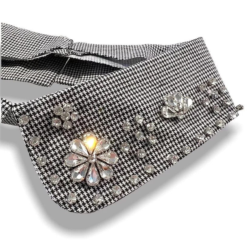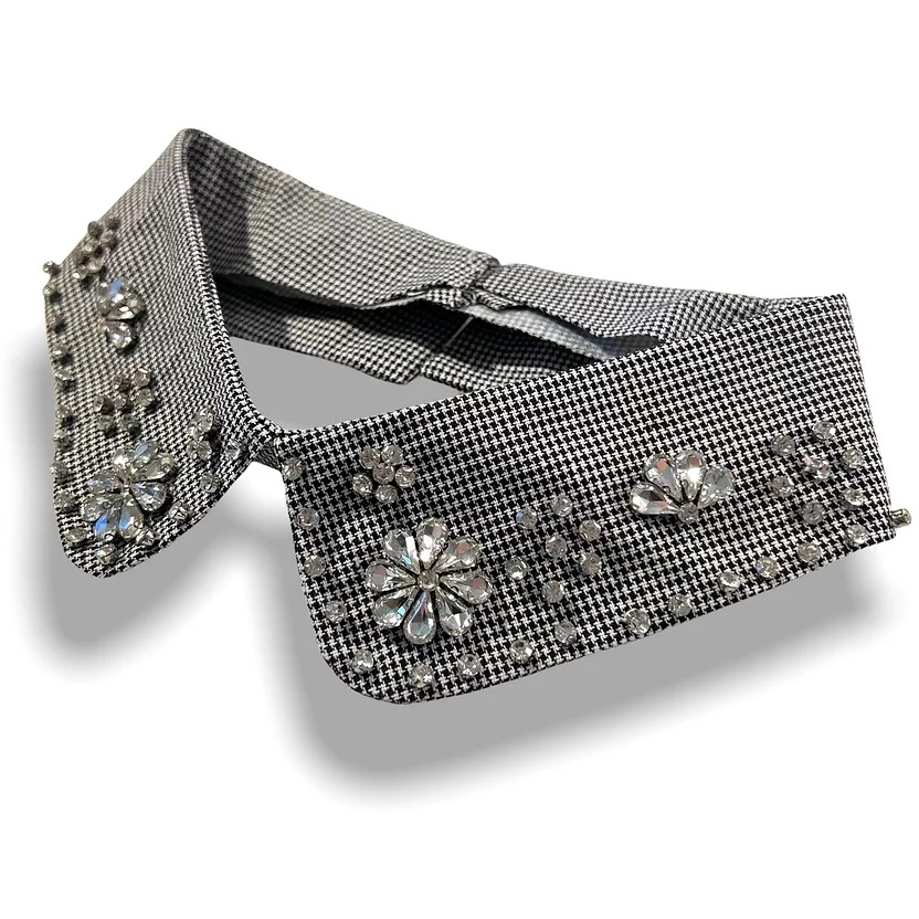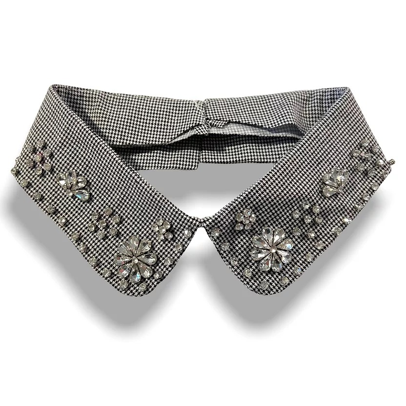 colletto fantasia pied de poule arricchito con pietre in vetro crystal, tutto interamente cucito a mano 42 cm x 5 cm