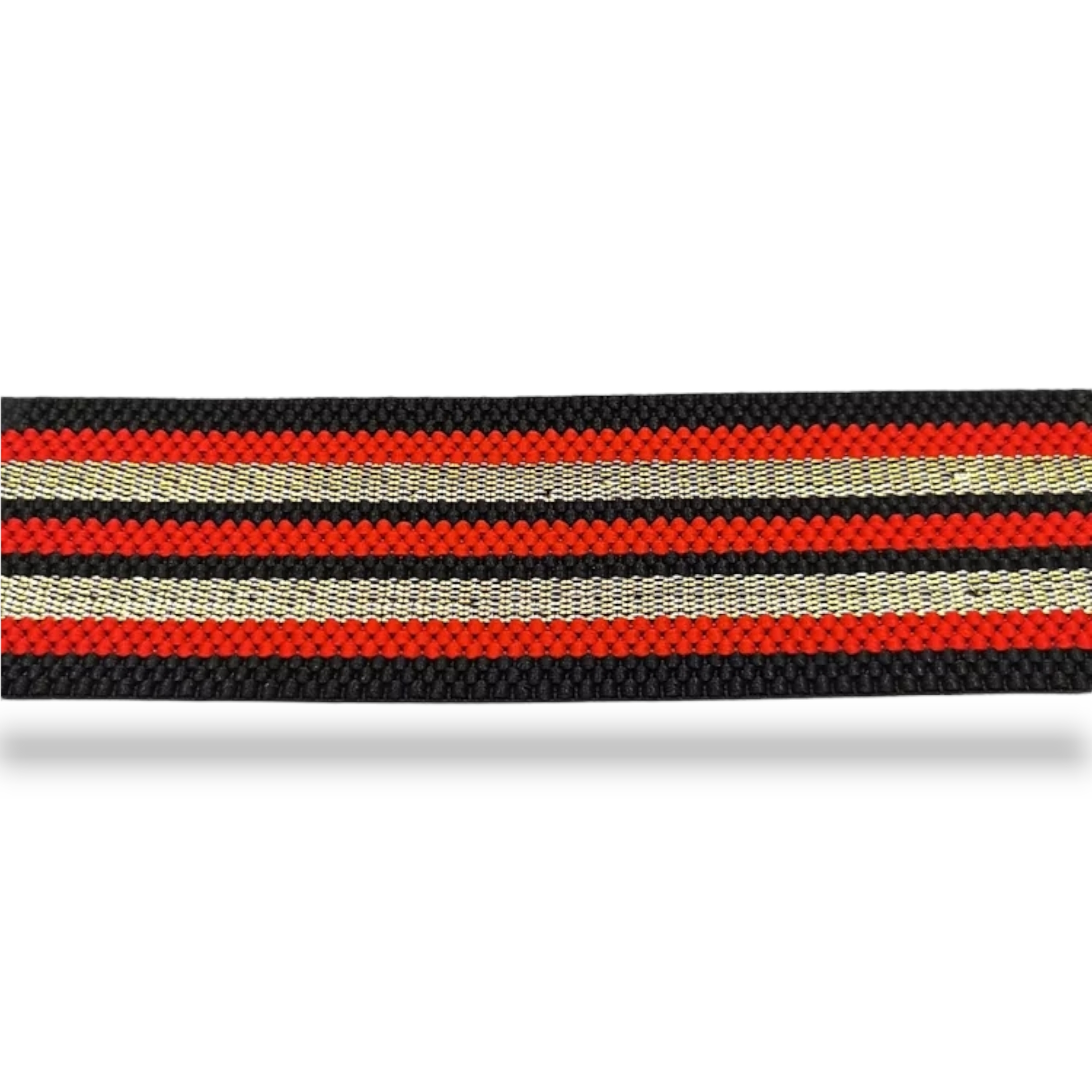 elastico nero con righe rosse, nere e lurex dorato cm 5