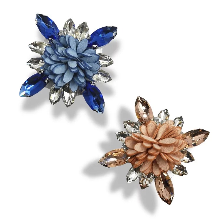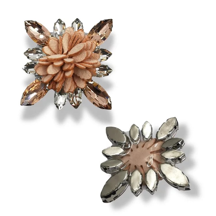l’ applicazione ha come base una pellicola adesiva ed È realizzata con pietre singole con castone e un fiore in tessuto di camos