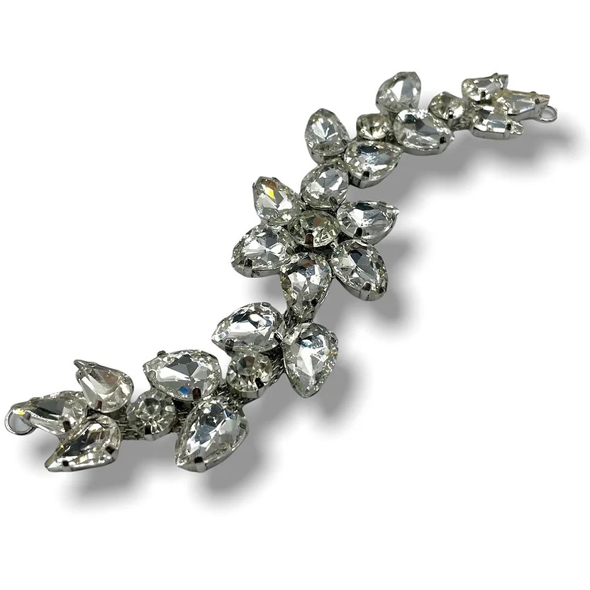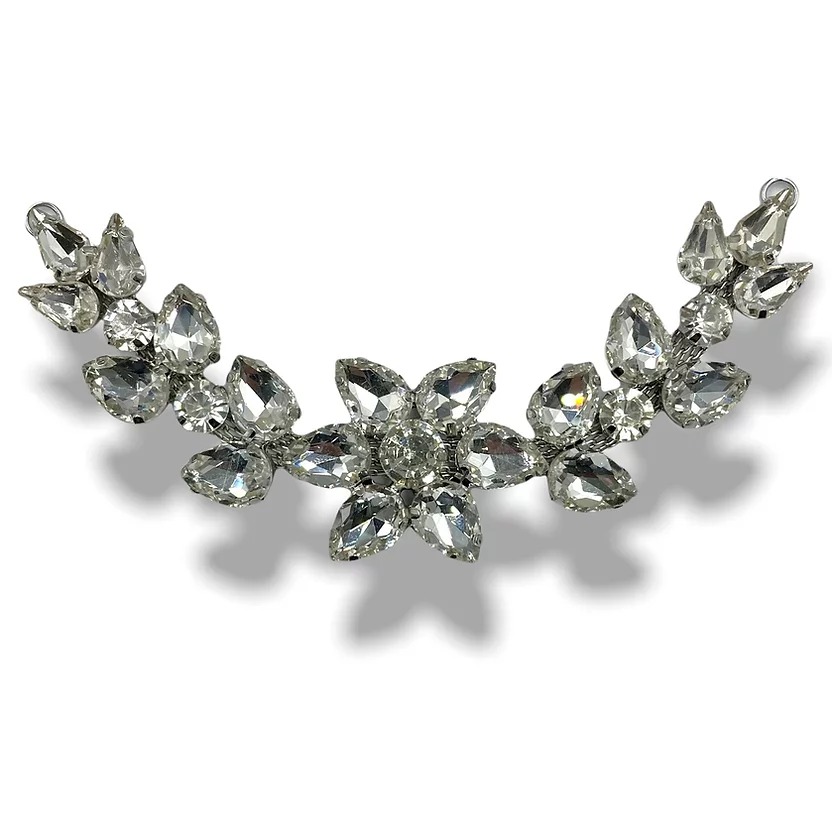 morsetto/scollo gioiello saldato, realizzato in tema floreale, con pietre in vetro crystal e castone rinforzato 15 cm x 3 cm.