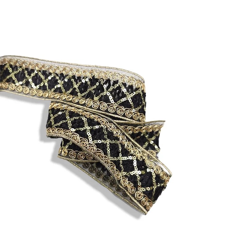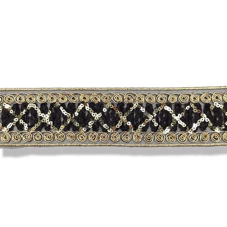 passamaneria a tema etnico su base di tulle nero, con paillettes tonde in filo lurex oro mm 48