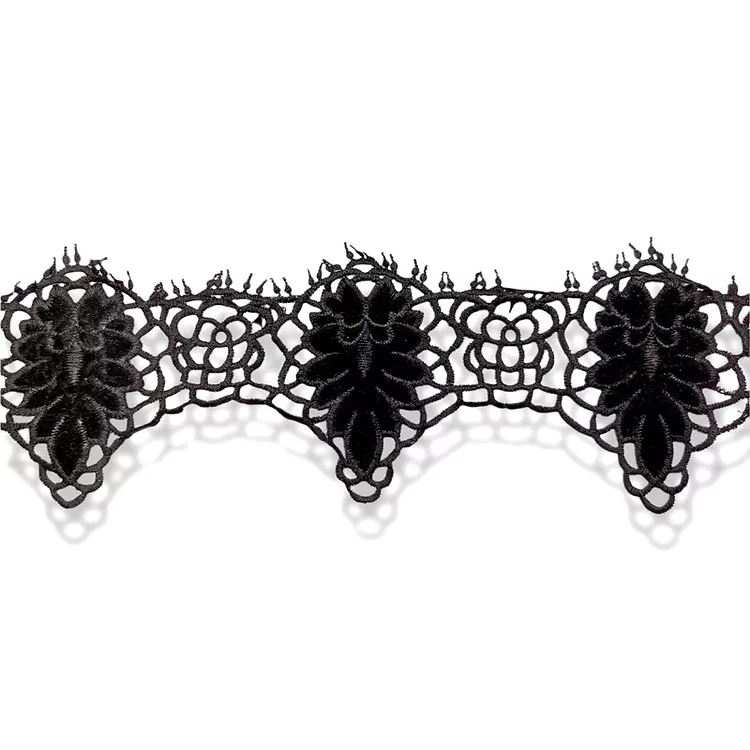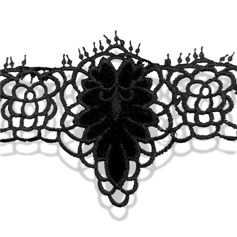passamaneria a tema floreale, traforata e ricamata in cotone nero, realizzata con disegni disposti in serie e inserti in velluto