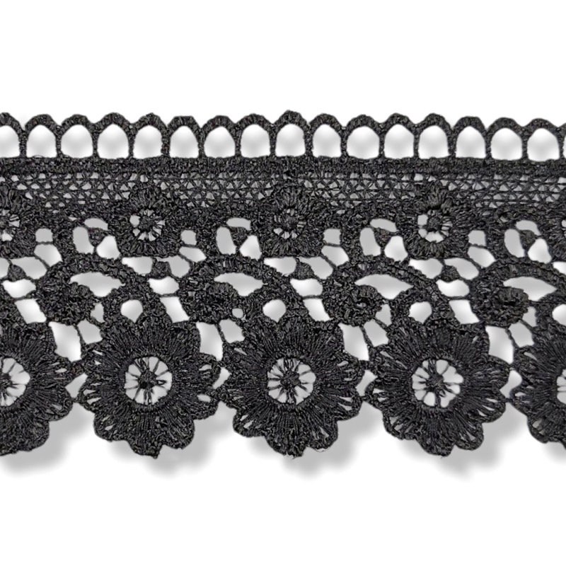 passamaneria a tema floreale, traforata e ricamata, realizzata in macramÈ nero con disegni disposti in serie 60 mm