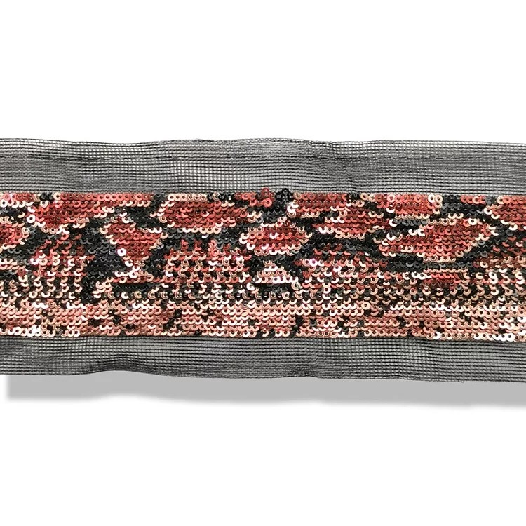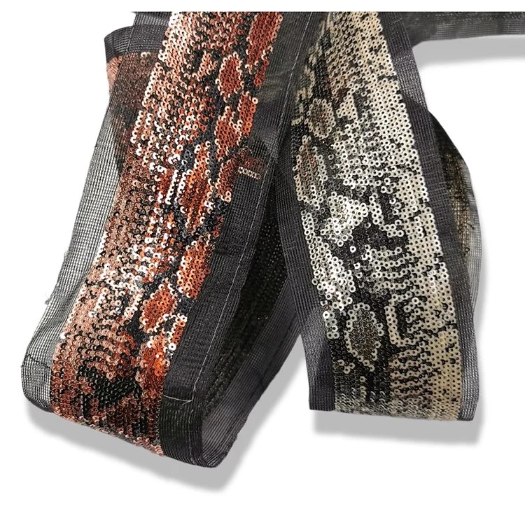 passamaneria a tema pitonato realizzata con paillettes ricamate su base di tulle mm 55
