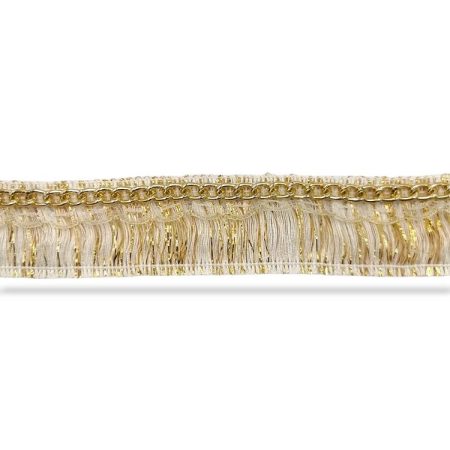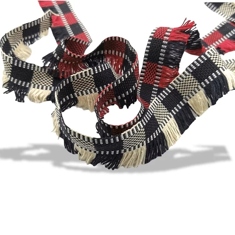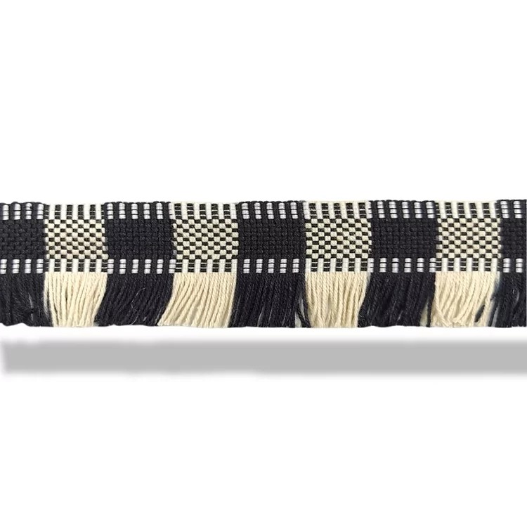 passamaneria a tema scacchi, realizzata con bandina centrale ricamata e frange 30 mm
