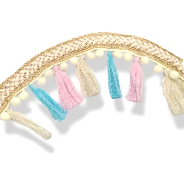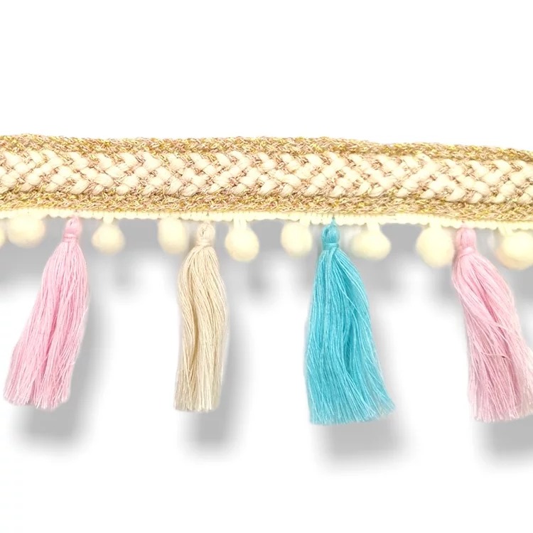passamaneria bandina realizzata ad intreccio, con pompon color crema e nappine colorate pendenti h totale 85 mm , di cui la band