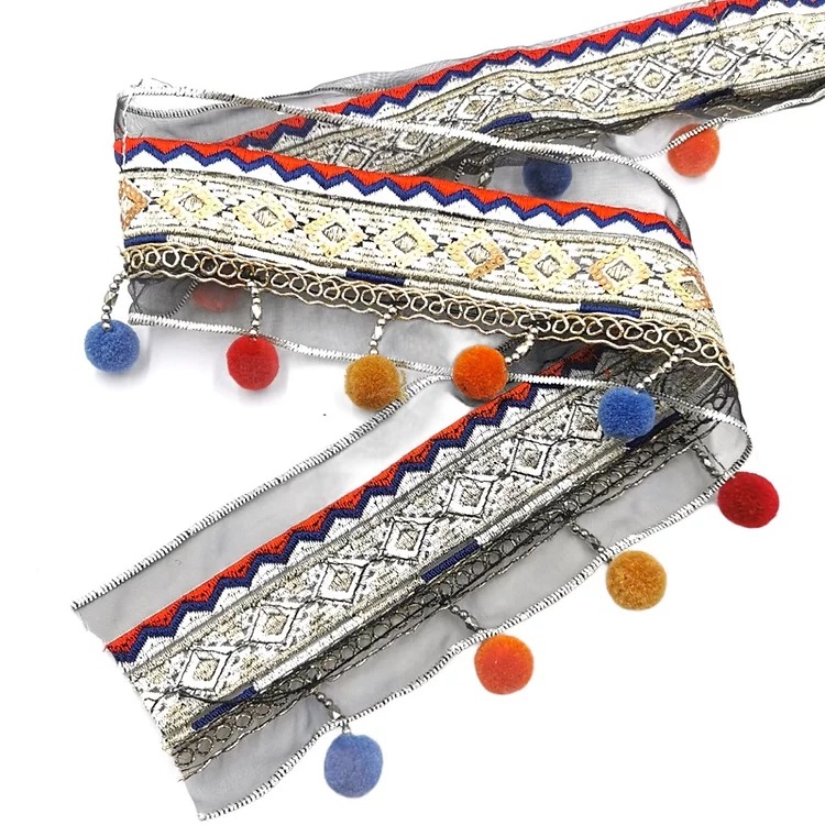 passamaneria con corallini silver e pompon h 72 mm , di cui la bandina 40 mm e i pendenti 32 mm