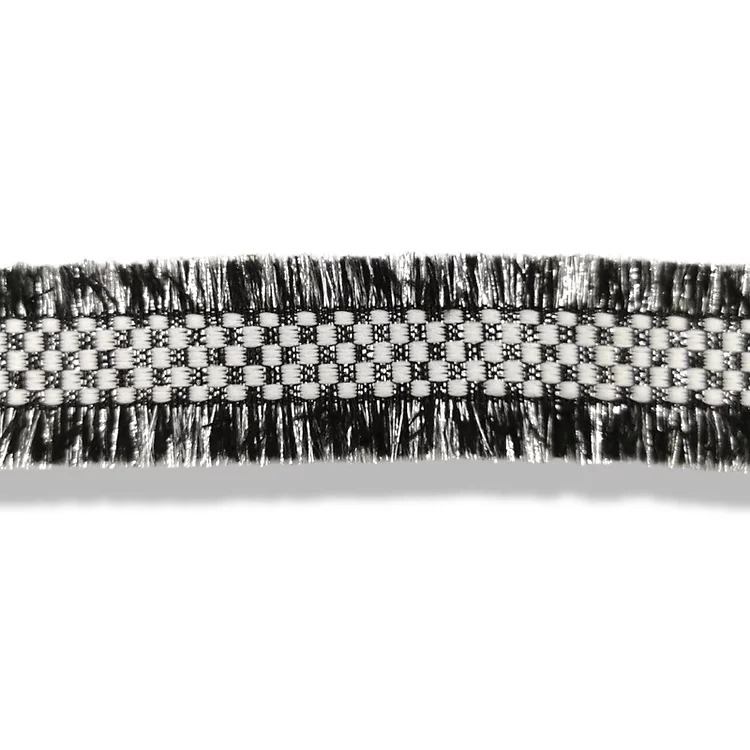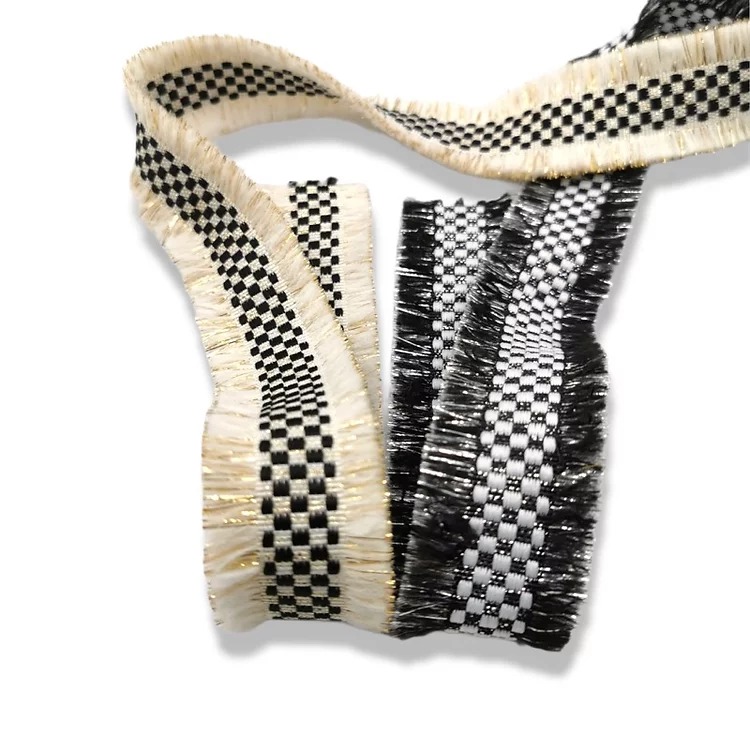 passamaneria con frange laterali, realizzata centralmente con inserti in filo lurex e disegn a scacchi mm 35
