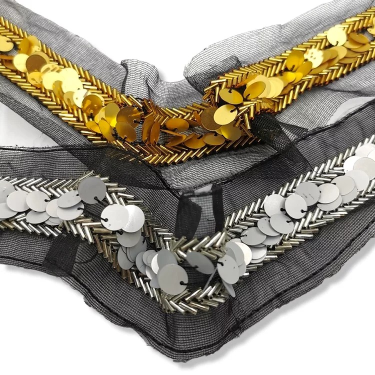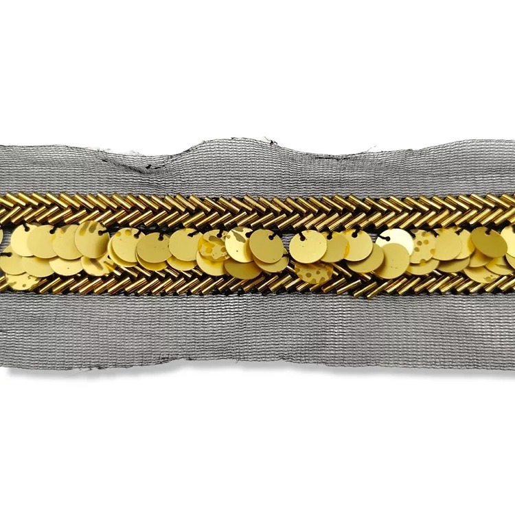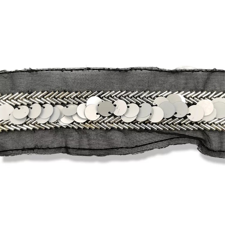 passamaneria con una base di tulle nero, con fila centrale composta da corallini e paillettes tonde mm 55