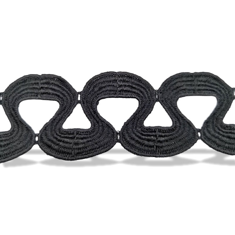 passamaneria di forma ondulata e ricamata interamente a macchina, in filo nero mm 40