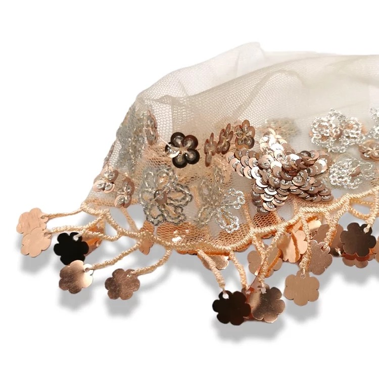 Recensisci per primo “passamaneria floreale, con fiori realizzati da paillettes ricamate e con ricami pendenti con paillettes come terminali mm 83”