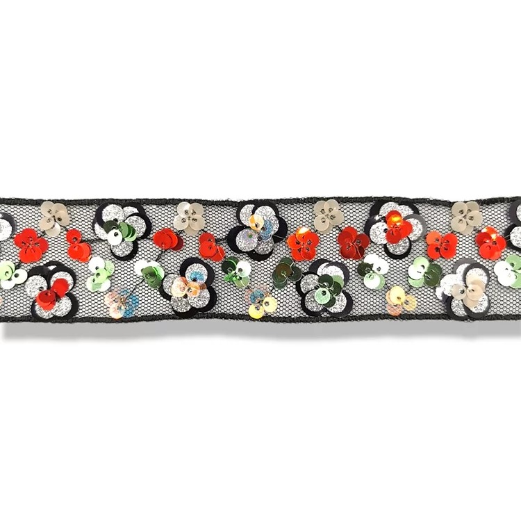 passamaneria floreale, realizzata da paillettes ricamate a forma di fiori su base di tulle nero mm 40