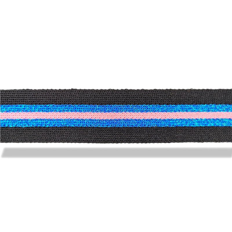 passamaneria in maglina, realizzata su fondo nero, con linee orizzontali laterali glitterate e da una linea centrale in filo ros