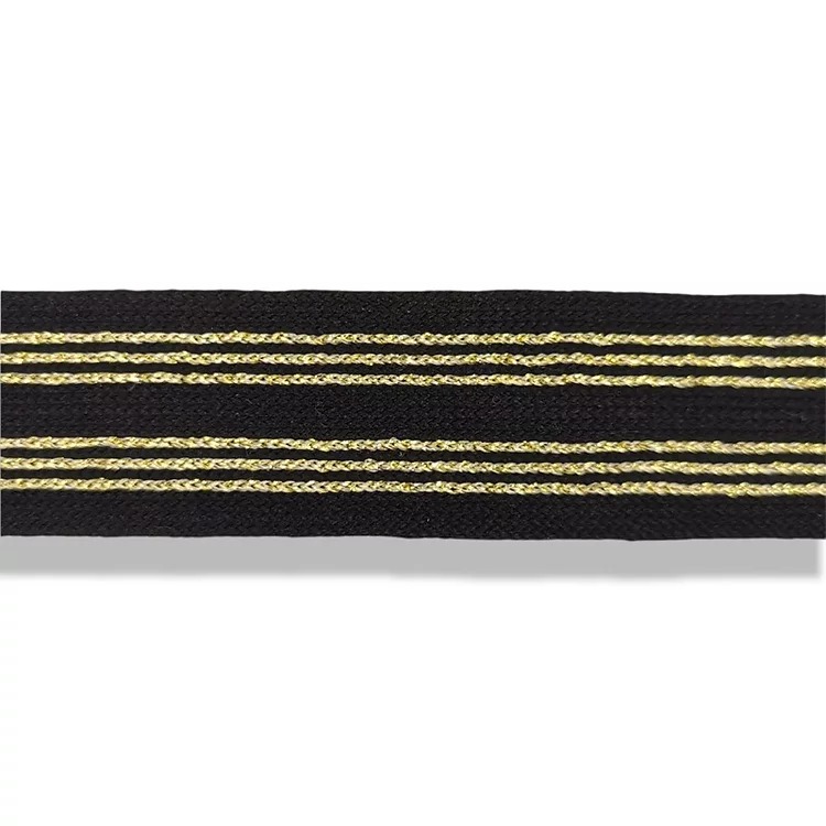 passamaneria in maglina, realizzata su fondo nero, con righini orizzontali in lurex oro mm 30