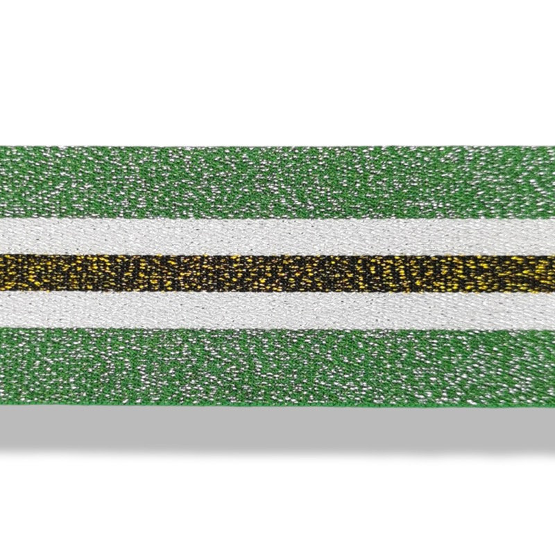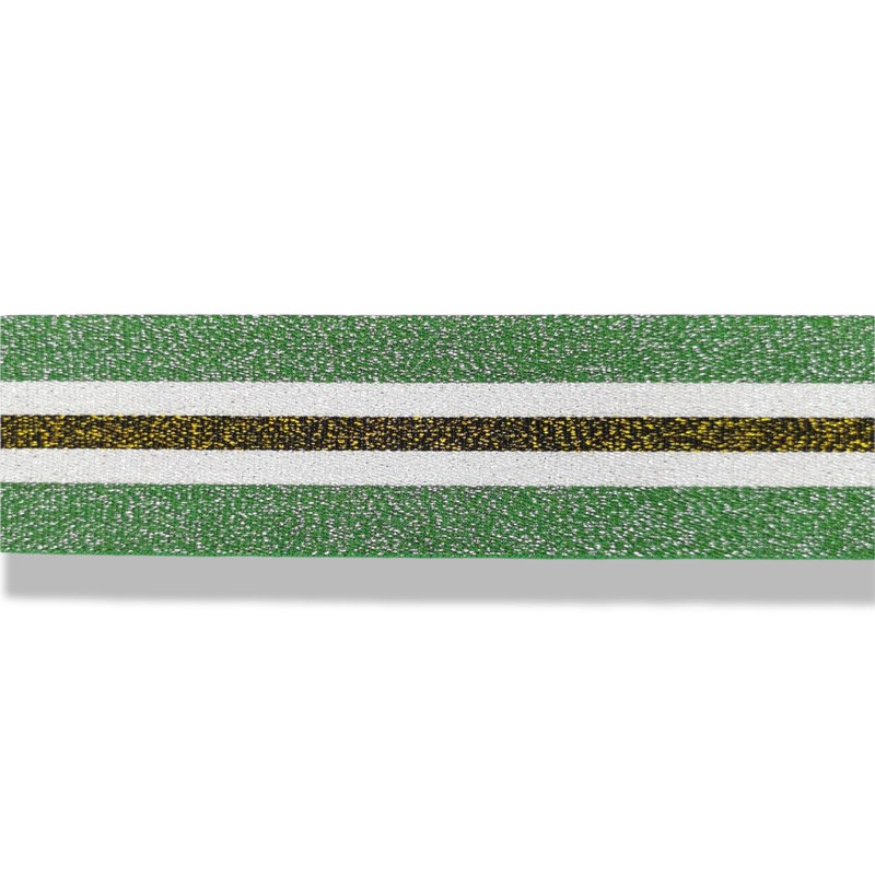 passamaneria in poliestere, realizzata con fili glitterati e composta da linee orizzontali bianche e verdi e da un righino centr