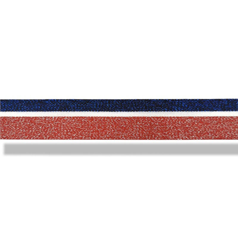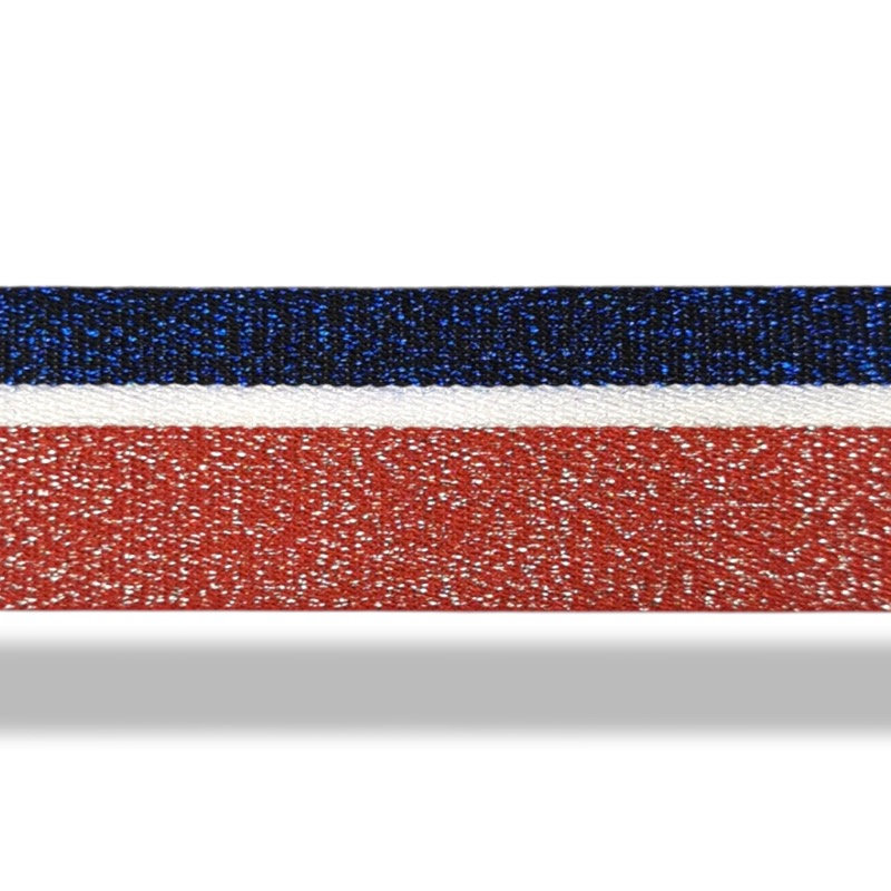 passamaneria in poliestere, realizzata con fili glitterati e composta da tre linee orizzontali, di colore rosso, bianco e blue m