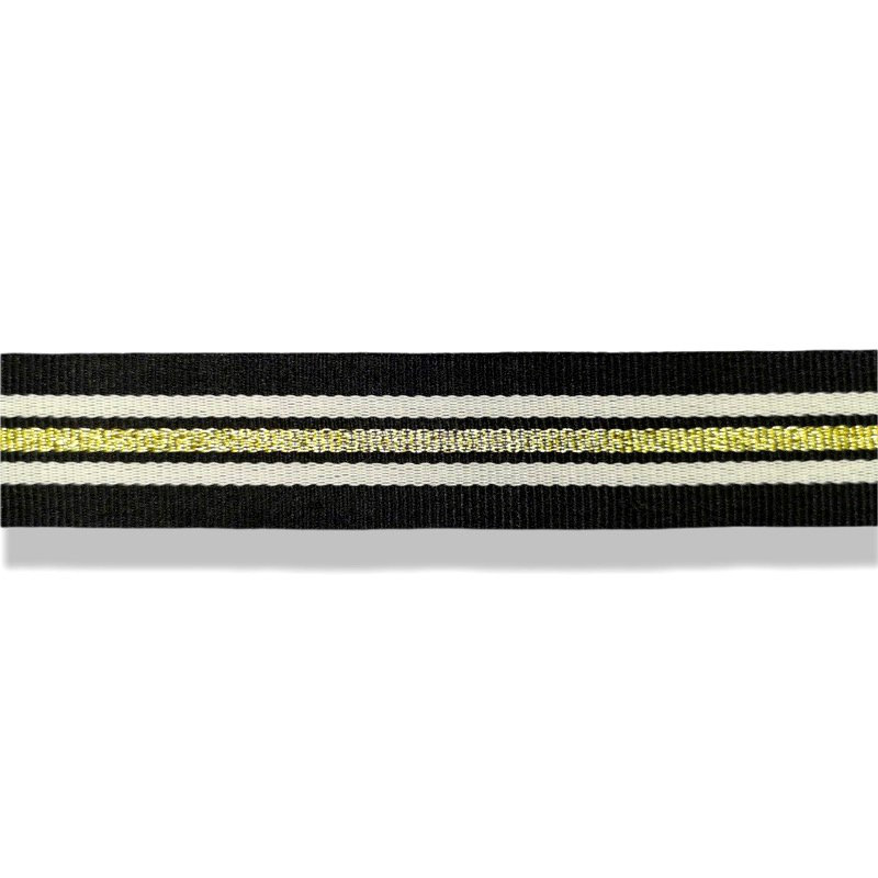 passamaneria in poliestere, realizzata su fondo nero, con linee orizzontali laterali di color bianco e da una linea centrale in