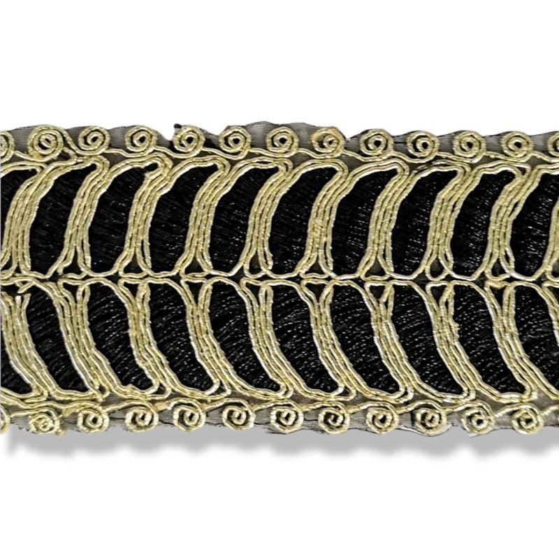 passamaneria in tema etnico, realizzata con inserti in filo lurex oro, che adornano la base in tulle nero mm 55