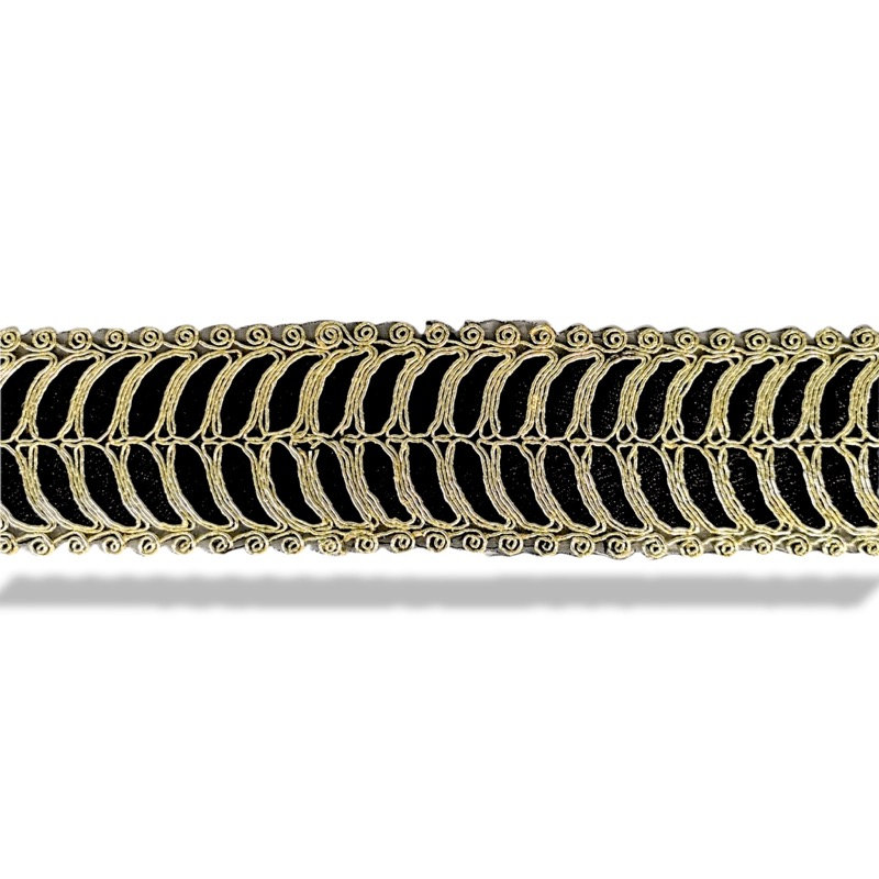 Recensisci per primo “passamaneria in tema etnico, realizzata con inserti in filo lurex oro, che adornano la base in tulle nero mm 55”