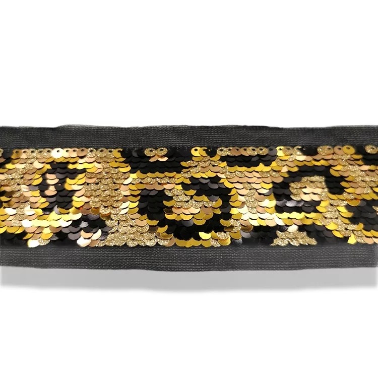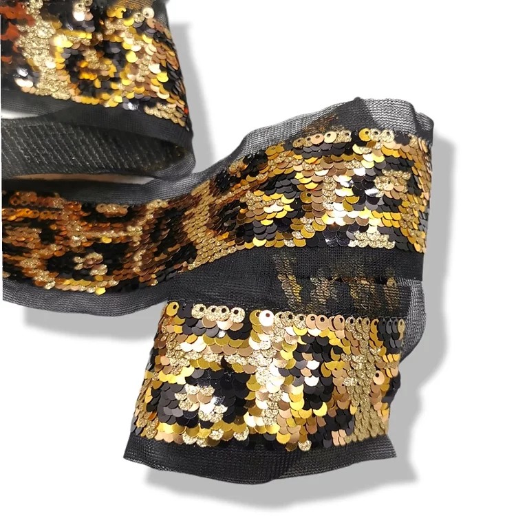 passamaneria maculata realizzata con paillettes lucide ricamate su base di tulle nero mm 65