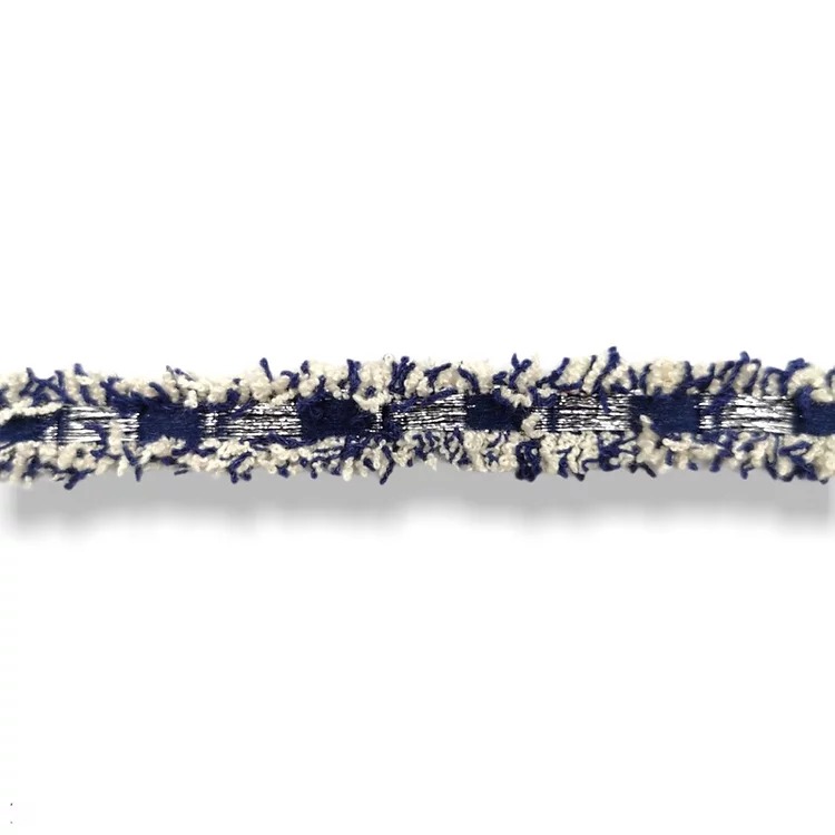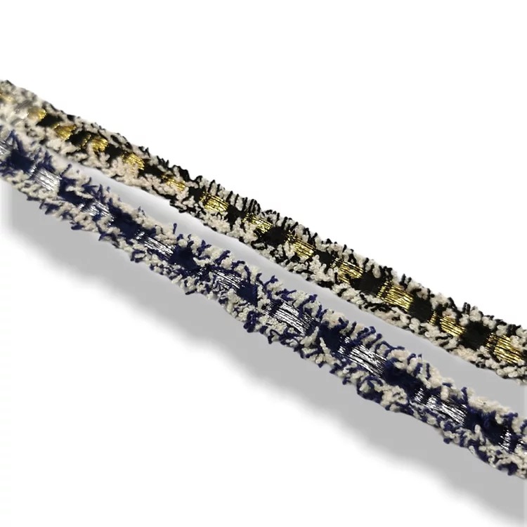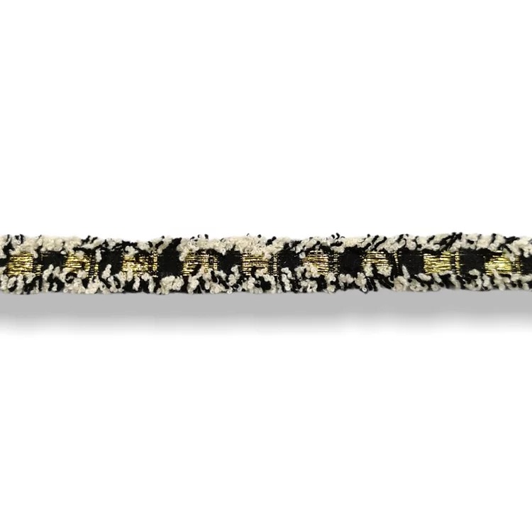 passamaneria realizzata centralmente con inserti in filo lurex oro e argento, mentre lateralmente con frange colorate mm 15
