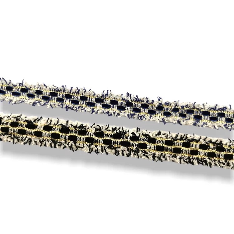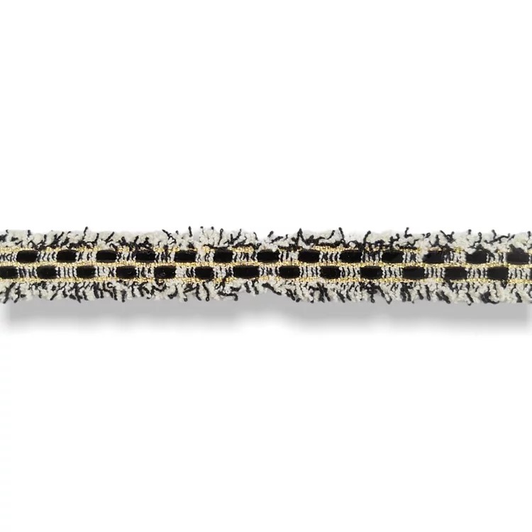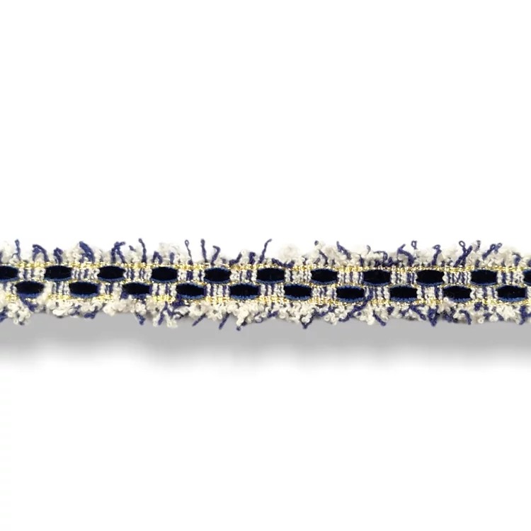 passamaneria realizzata centralmente con inserti in filo lurex oro e disegni geometrici, mentre lateralmente con frange colorate