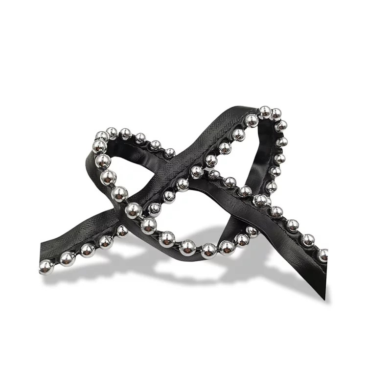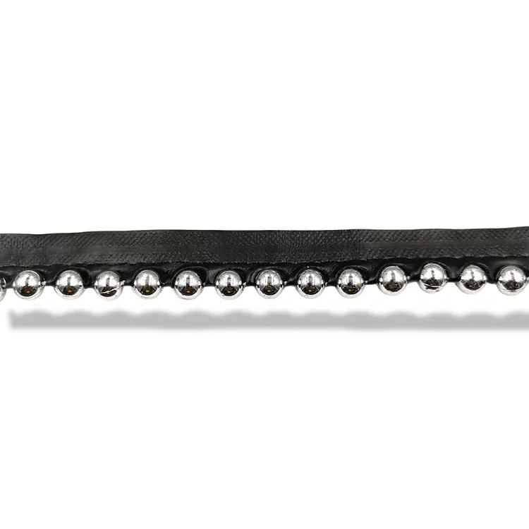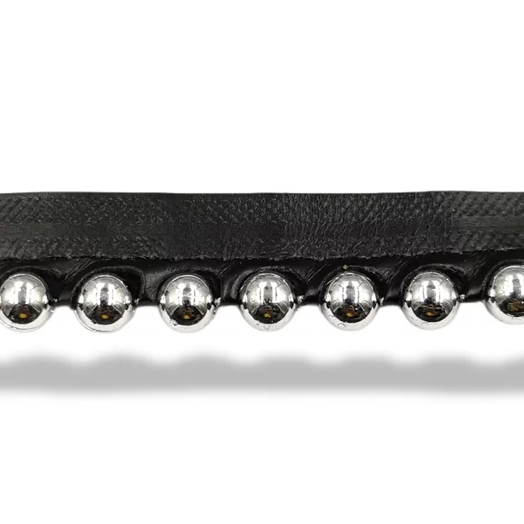passamaneria realizzata con bandina in eco-pelle nera e all’interno vi sono file di borchie silver rotonde h totale 20 mm, con