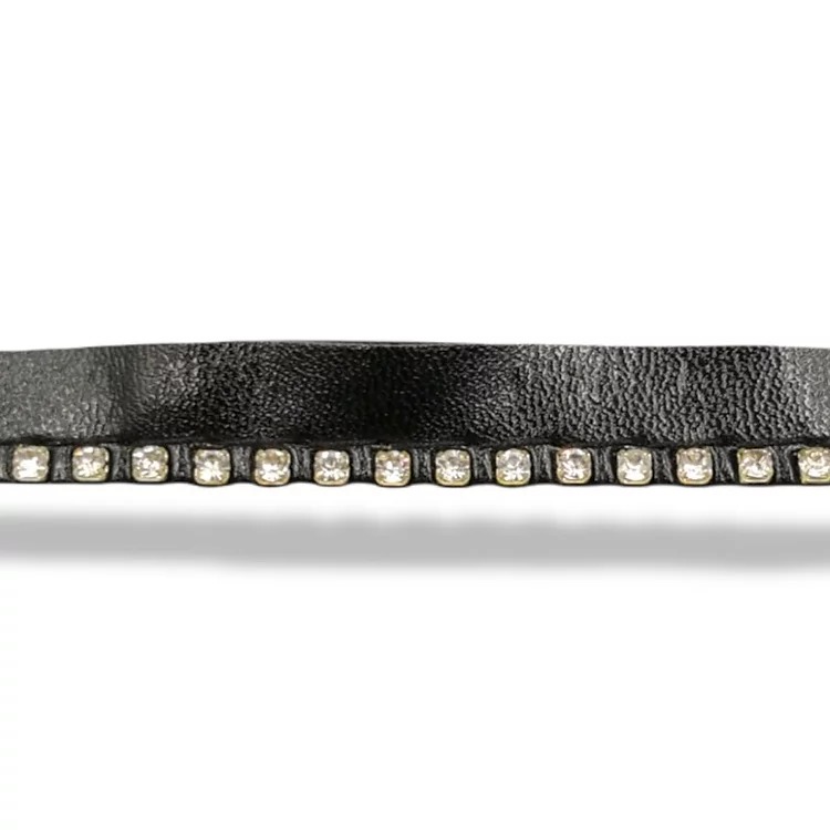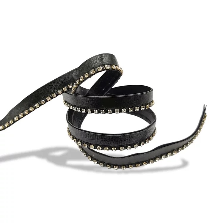passamaneria realizzata con bandina in eco-pelle nera e all’interno vi sono file di strass h totale : 10 mm, con strass da 2 mm