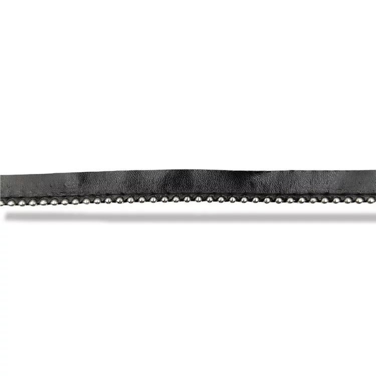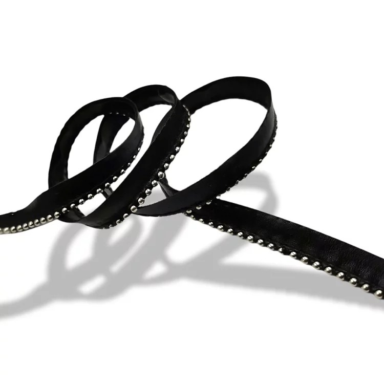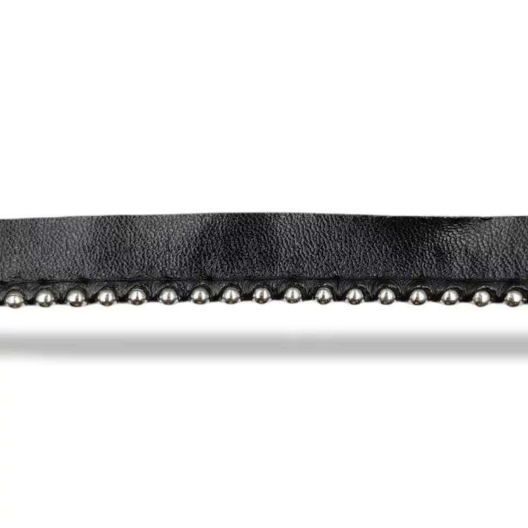 passamaneria realizzata con bandina in eco-pelle nera ed all’interno vi sono file di borchie silver rotonde h totale : 13 mm, co