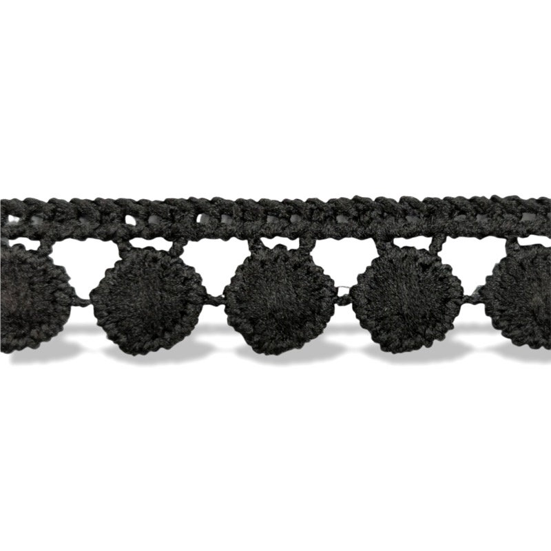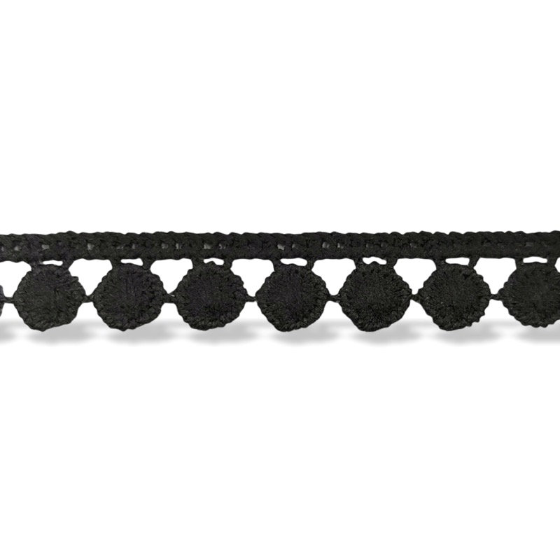 passamaneria realizzata con bandina superiore ricamata e pallini nella parte inferiore, ricamati in filo e disposti in serie mm