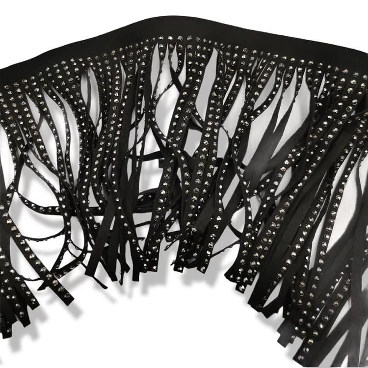 passamaneria realizzata con frange a cui sono state applicate borchie sfaccettate color ematite cm 14