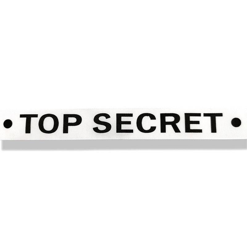 passamaneria realizzata con gros grain bianco e stampa centrale nera, riportante la scritta ” top secret ” mm 30