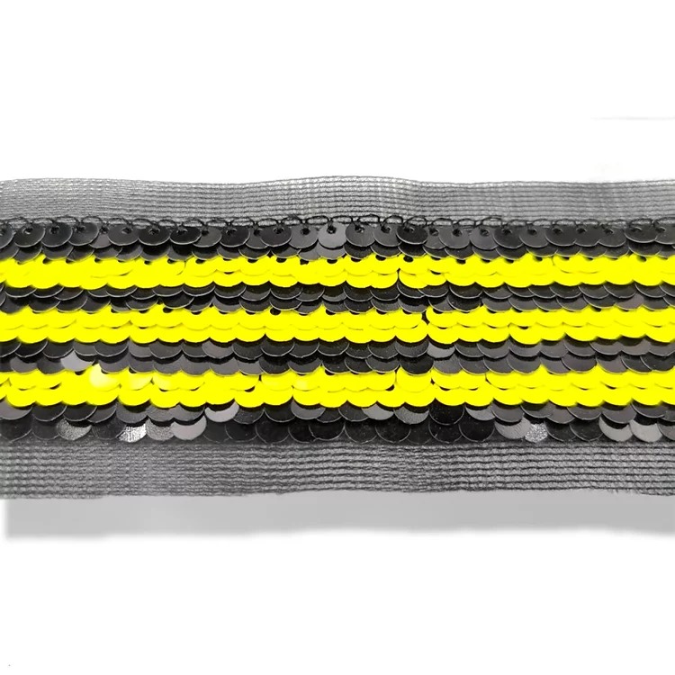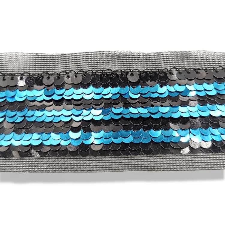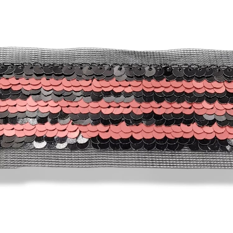 passamaneria realizzata con paillettes reversibili disposte su sette file orizzontali in base di tulle nero mm 50