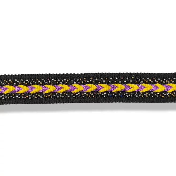 passamaneria realizzata con ricamo centrale e file di perline, e frange che ne delineano i bordi mm 28